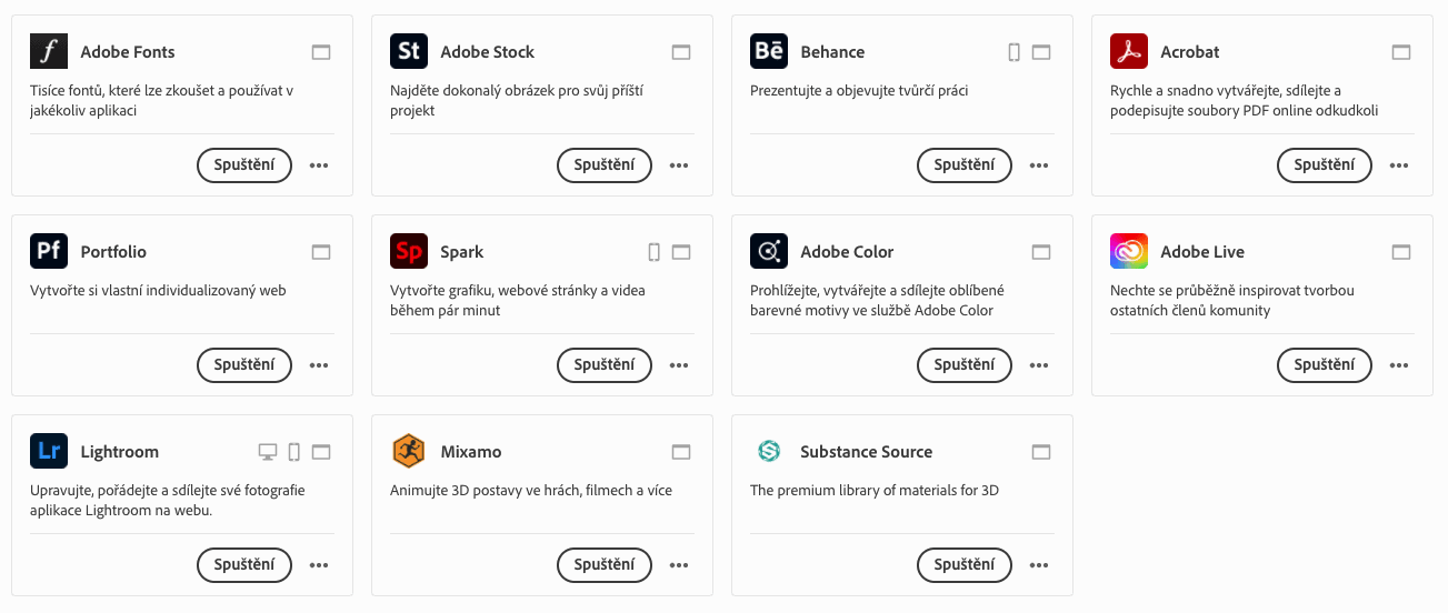 Přehled aplikací Adobe dostupných v rámci cenového plánu pro digitální fotografii.